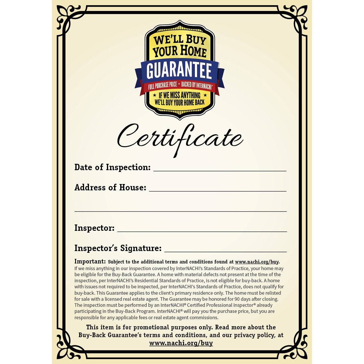 This "We'll Buy Your Home Back" Guarantee certificate is available as a pdf that you can download and print in full color. Present to your clients at the end of the inspection. They'll save the certificate and know where to find your name the next time they want to refer a friend, co-worker, neighbor, or family member to the best home inspector in town.