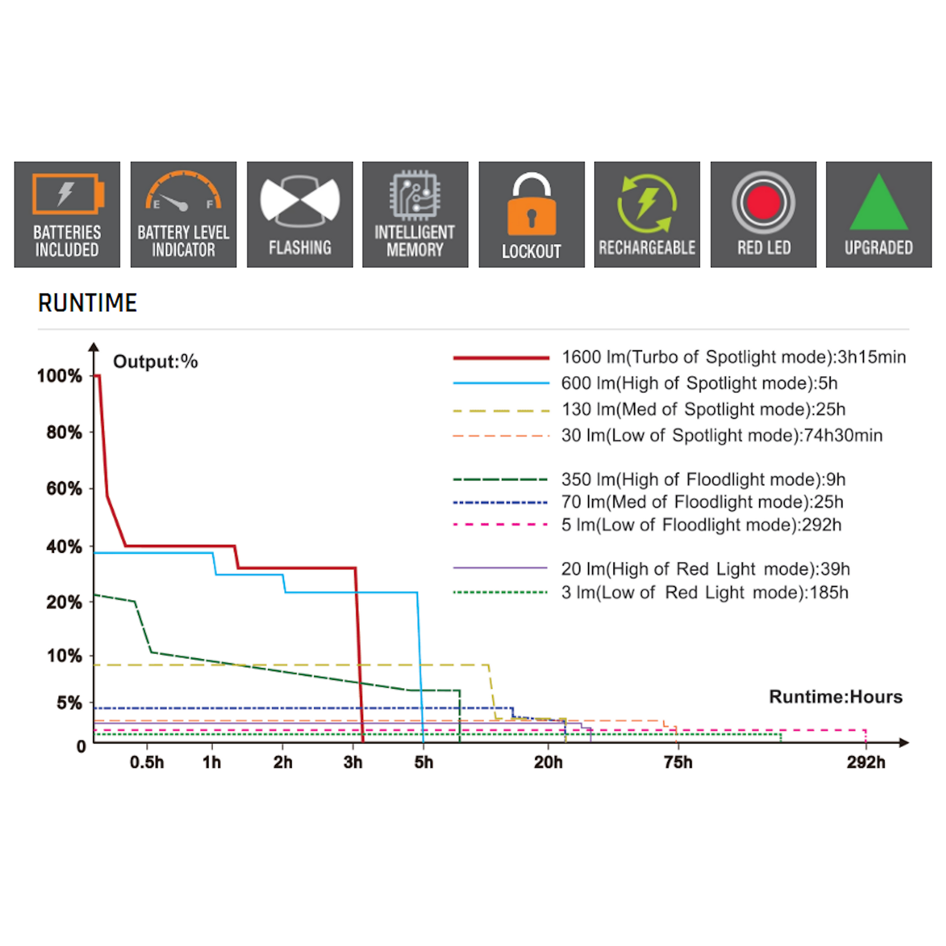 - Lighting Modes: Ten lighting modes including four spotlight levels, three floodlight levels, two levels of red light and red flash