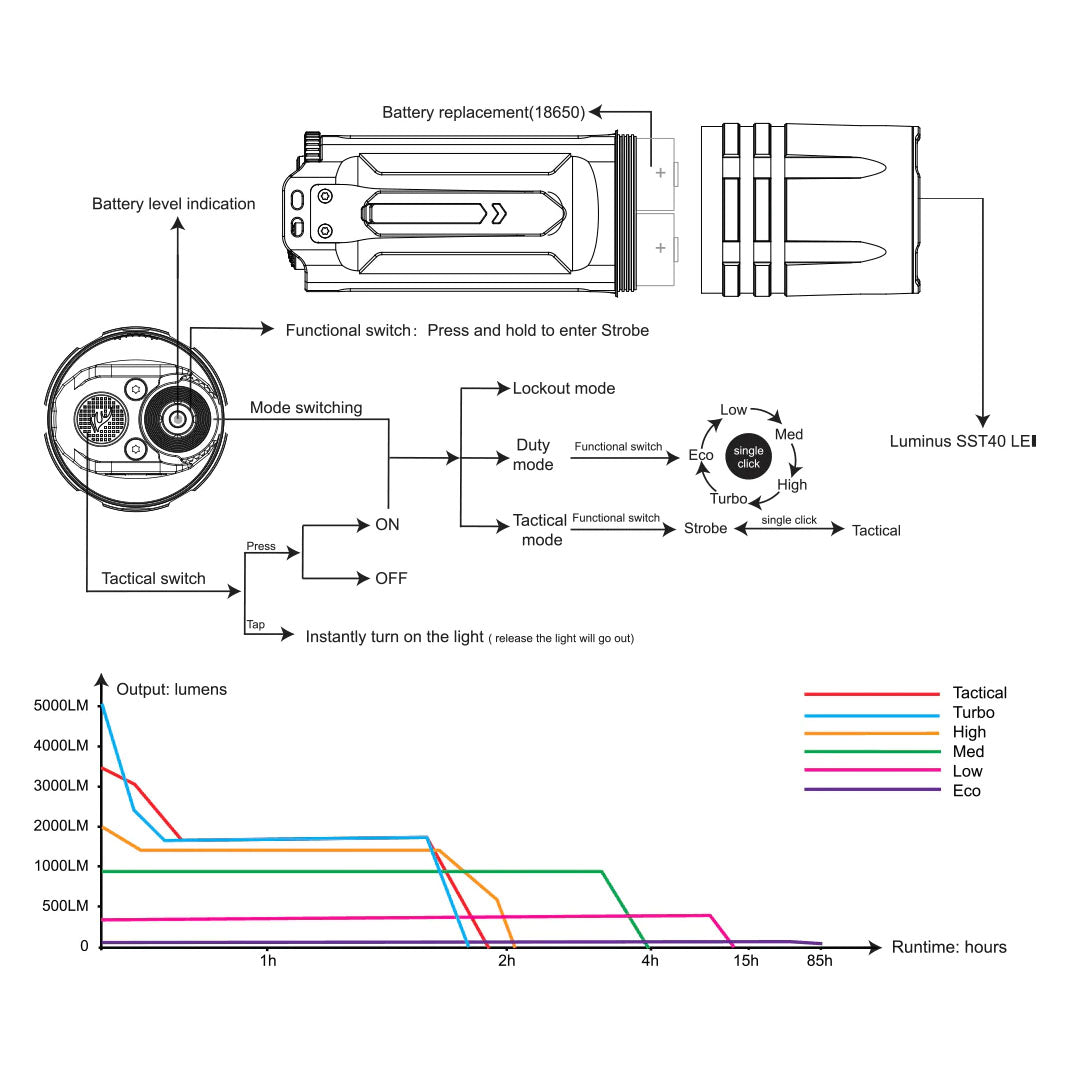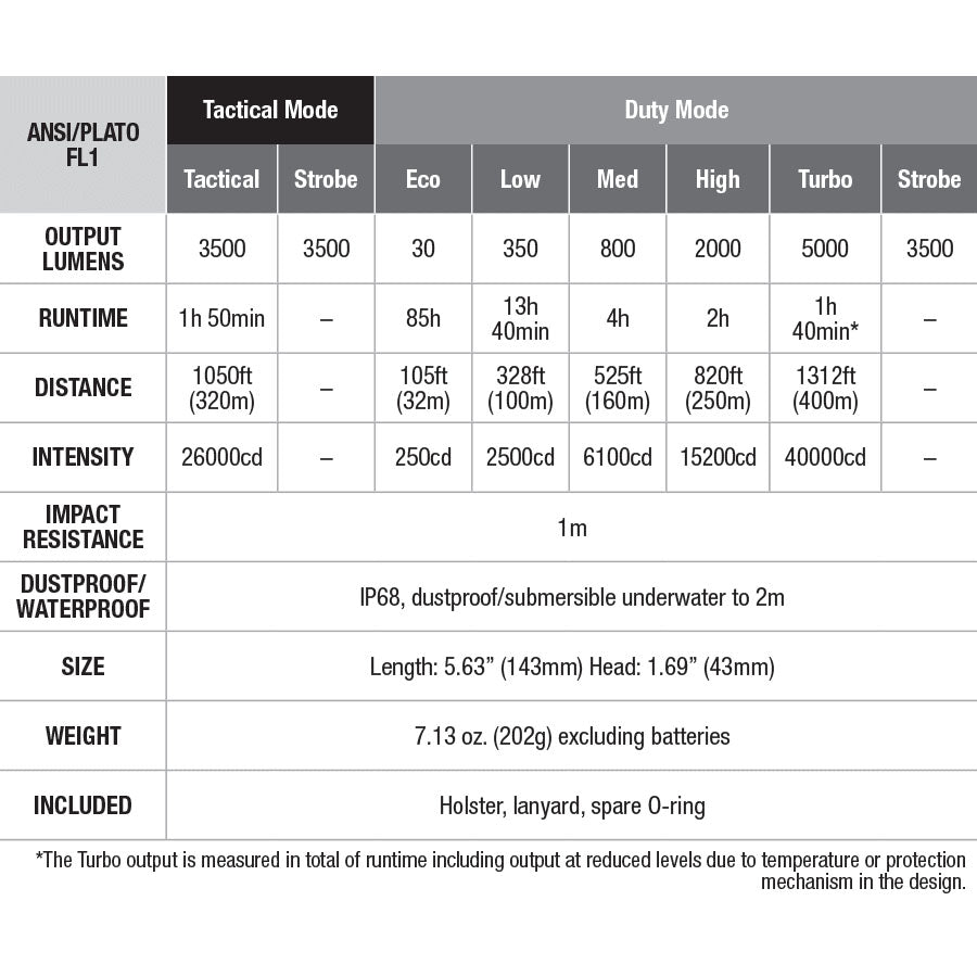 Lighting Modes: Turbo and strobe in Tactical mode. 5 brightness levels plus strobe in Duty mode.