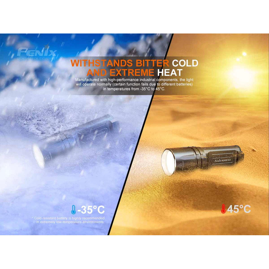 Notice: The mentioned parameters (lab-tested by using two Fenix ARB-L18-3500 18650 rechargeable Li-ion batteries) may vary between flashlights, batteries and environment.