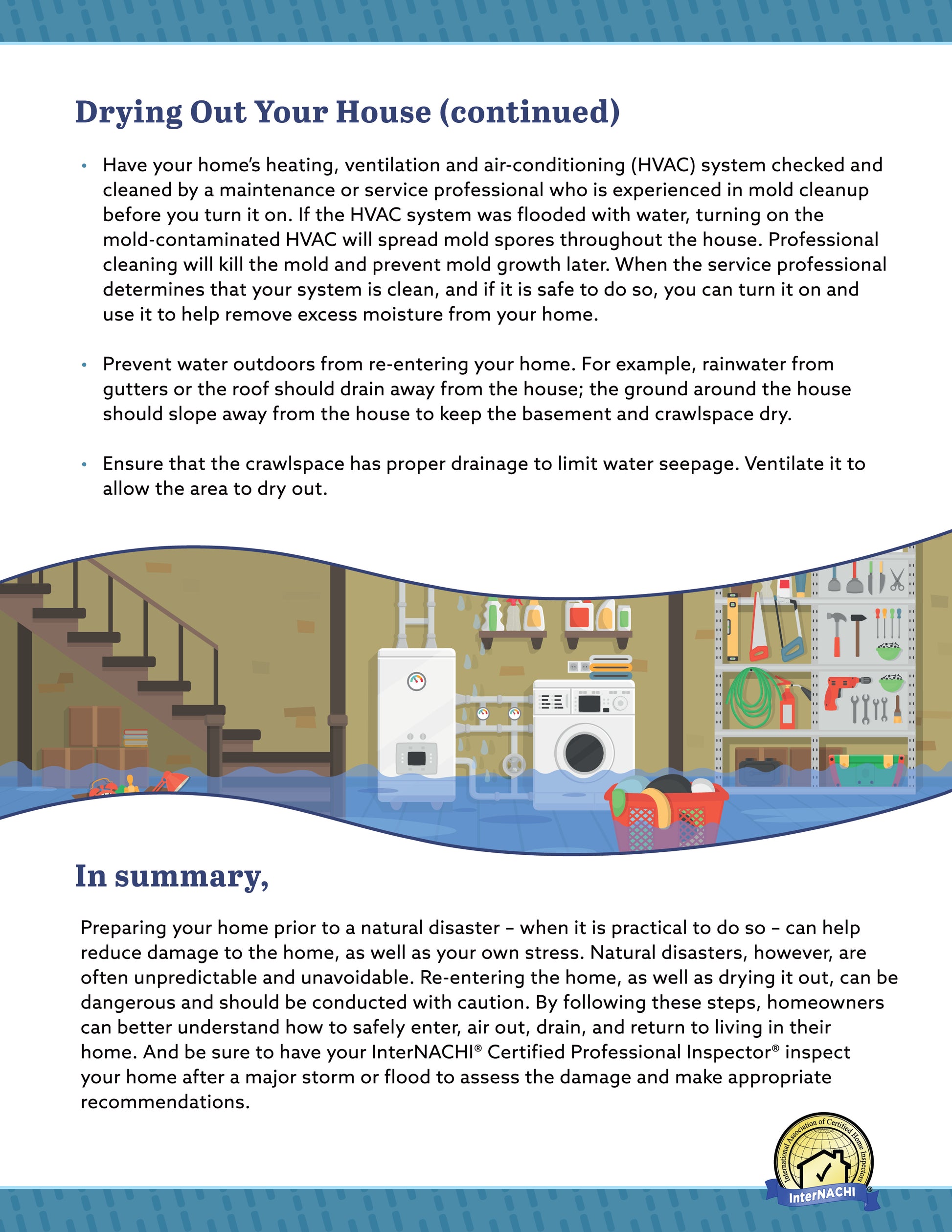 Provide your clients and social media followers with tips for entering and drying out their home if it becomes flooded. Print out the high-resolution flyer as a leave-behind, or send to your clients via email or as a download.
