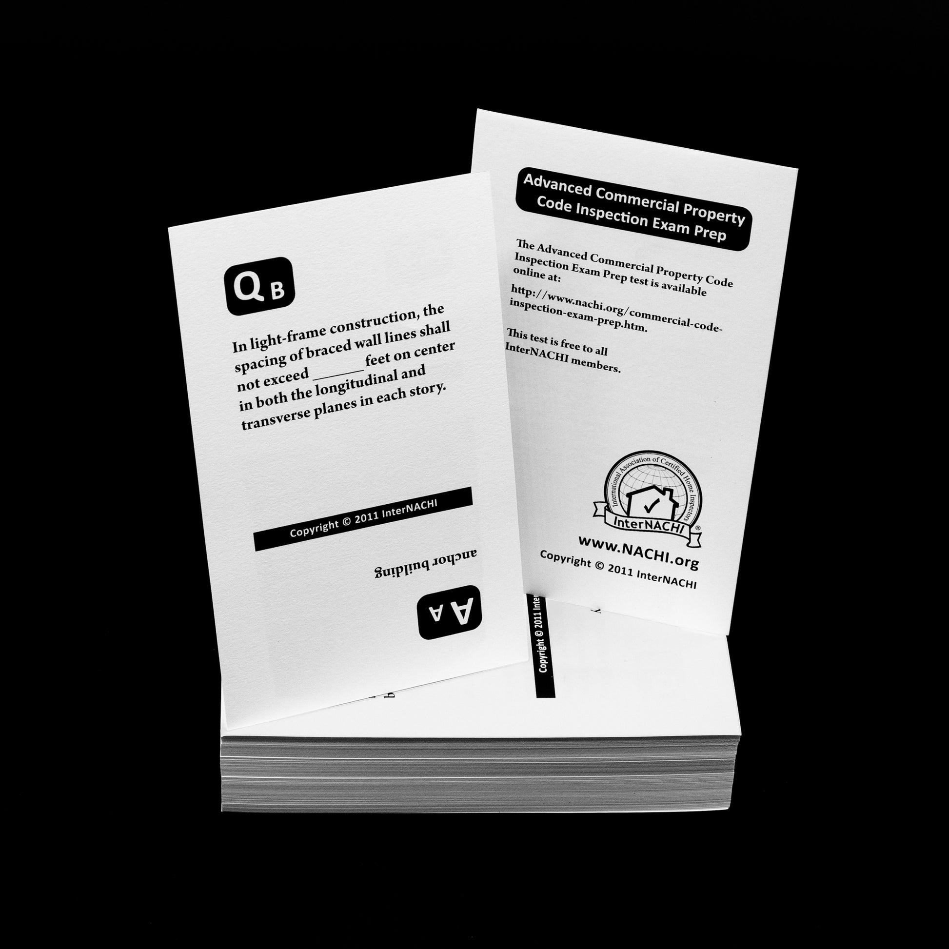 These flash cards are based on basic information found in the International Building Code (IBC), which is a comprehensive code that provides minimum requirements to safeguard the public health, safety and general welfare of the occupants of new and existing buildings and structures. With daily drilling using these flash cards, your goal is to be able to answer most of the nearly 200 questions without difficulty. When you’ve reached that point, you’re ready to ace your test! The Advanced Commercial Code Inspection Exam Prep test is available online by clicking here. This test is free to all InterNACHI members.